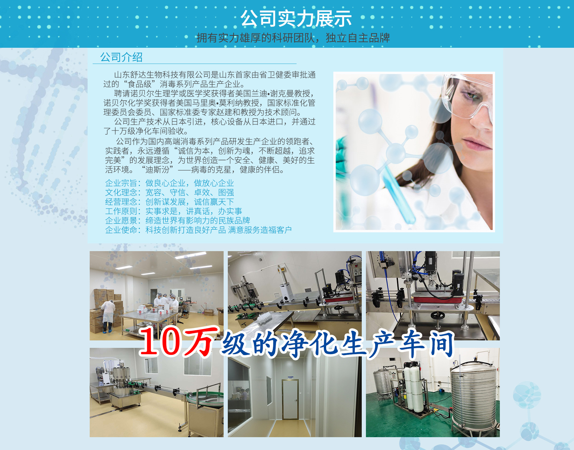 山東舒達生物科技有限公司是山東首家由省衛健委審批通過的“食品級”消毒系列產品生產企業。聘請諾貝爾生理學或醫學獎獲得者美國蘭迪·謝克曼教授,諾貝爾化學獎獲得者美國馬里奧·莫利納教授,國家標準化管理委員會委員、國家標準委專家趙建和教授為技術顧問。公司生產技術從日本引進,核心設備從日本進口,并通過了十萬級凈化車間驗收。 生產的“迪斯汾”牌消毒系列產品經國家權威機構“中關村國際醫藥檢驗認證科技有限公司”、“廣州微生物研究所”檢測認證,殺菌范圍廣譜,適應范圍廣泛,可直接入口,安全無毒,滅菌率達99.99%以上。經“上海化工院檢測有限公司”檢測鑒定為非限制性貨物,可海運、空運、陸運。并通過CE認證,可直接出口歐盟。 被國家發改委列為全國性疫情重點保障企業,被濰坊市疾病防控中心列為濰坊市防疫物資儲備單位。疫情期間“迪斯汾”牌消毒系列產品,被北京、上海、天津、重慶、山東、江蘇、浙江、四川、