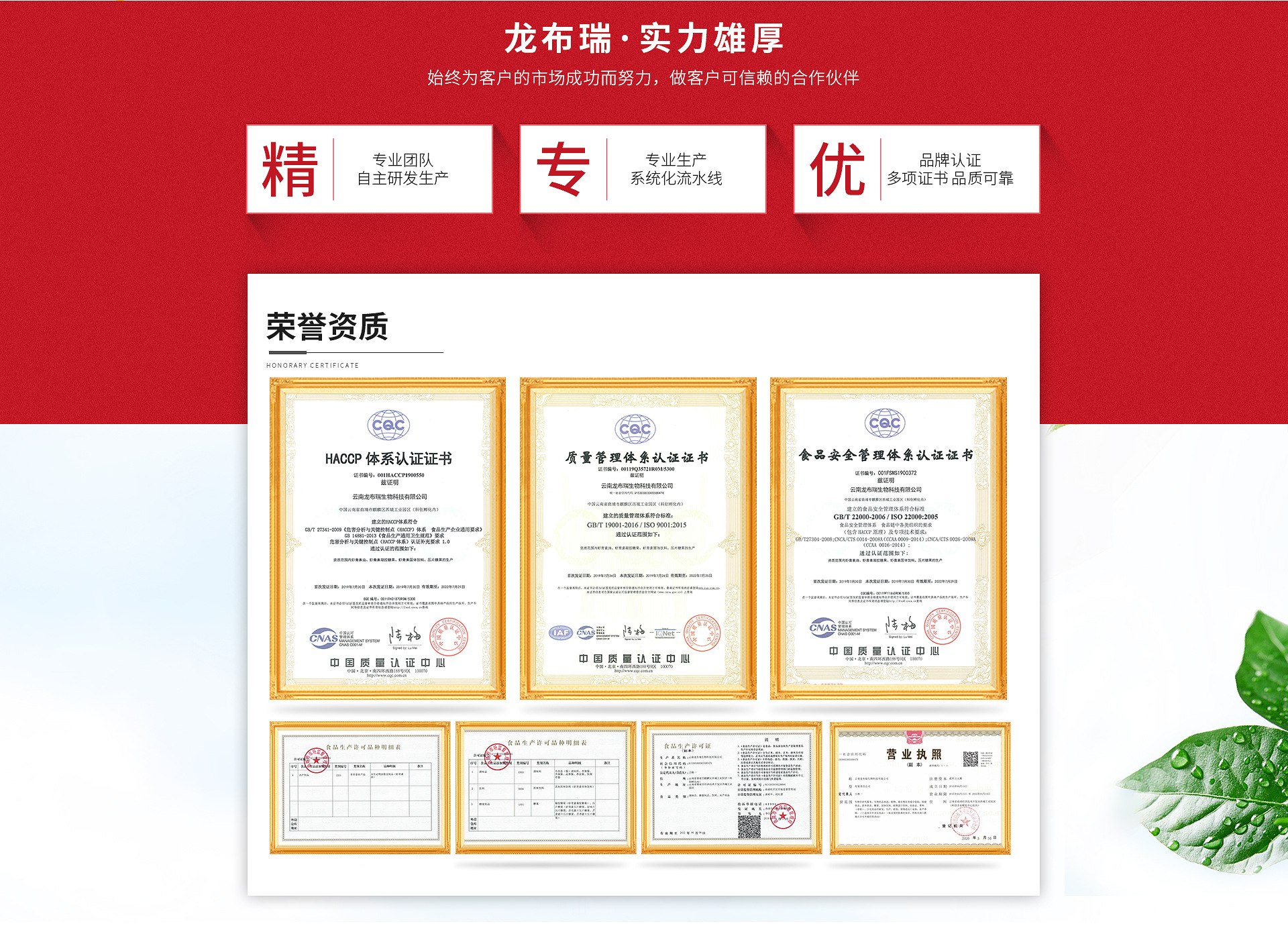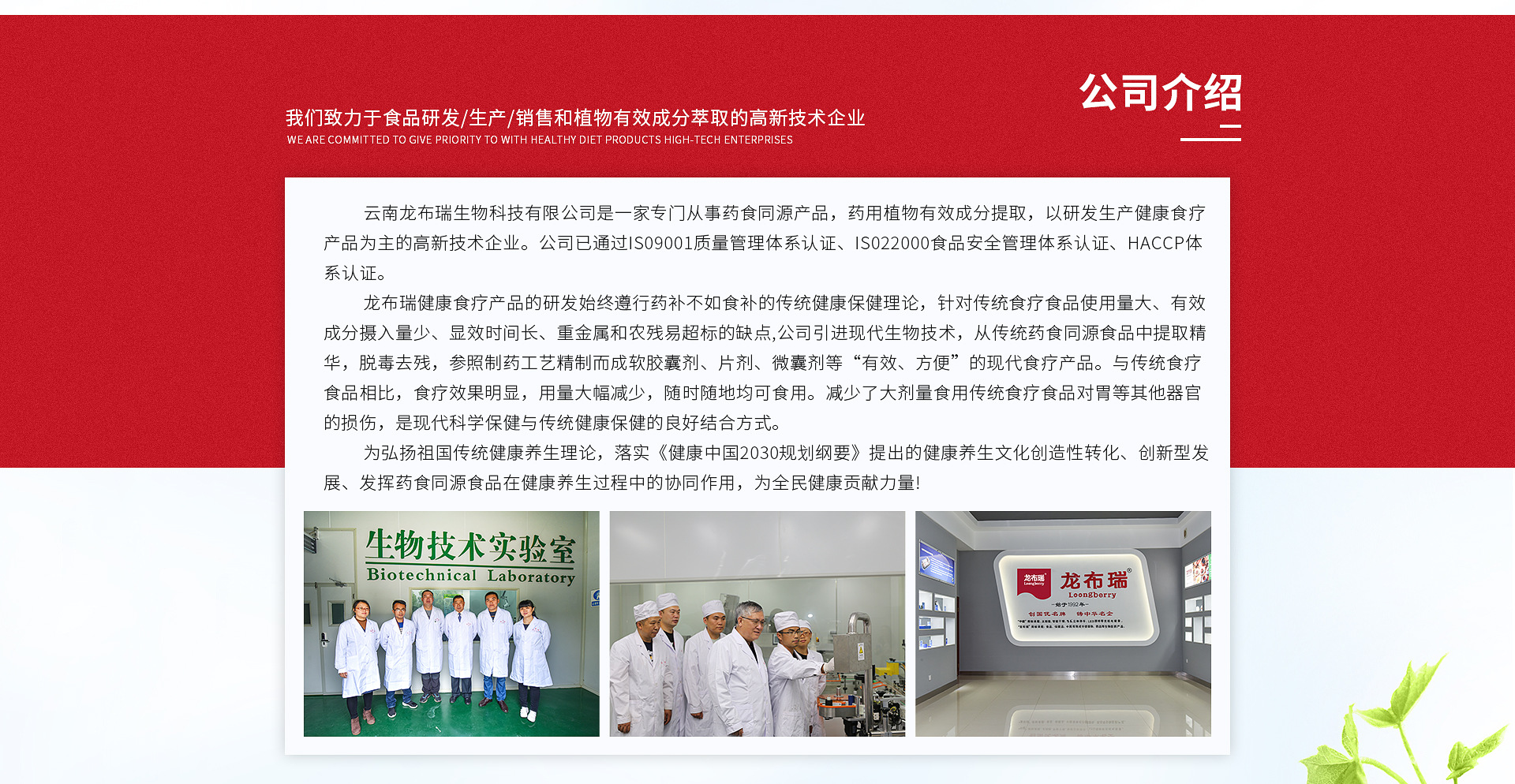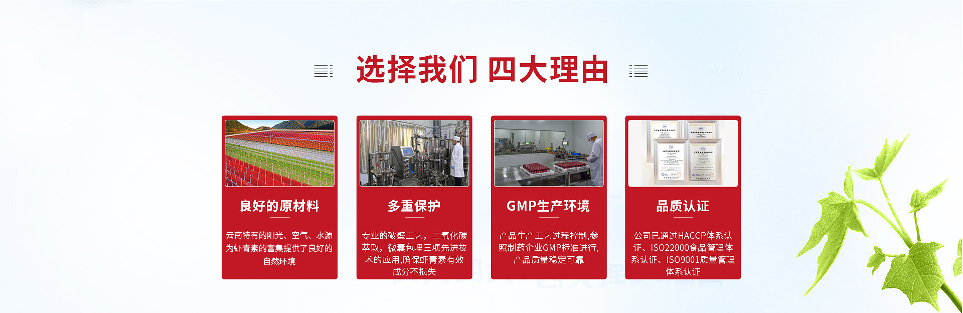云南龍布瑞生物科技有限公司是蝦青素、雨生紅球藻、蝦青素油等、雨生紅球藻等產品專業生產加工的公司,擁有完整、科學的質量管理體系。云南龍布瑞生物科技有限公司的誠信、實力和產品質量獲得業界的認可。歡迎各界朋友蒞臨參觀、指導和業務洽談。 云南龍布瑞生物科技有限公司是一家專門從事新資源食品研發,生產,銷售和植物有效成分萃取的高新技術企業。公司已通過ISO9001質量管理體系認證、ISO2200食品管理體系認證和HACCP體系認證。