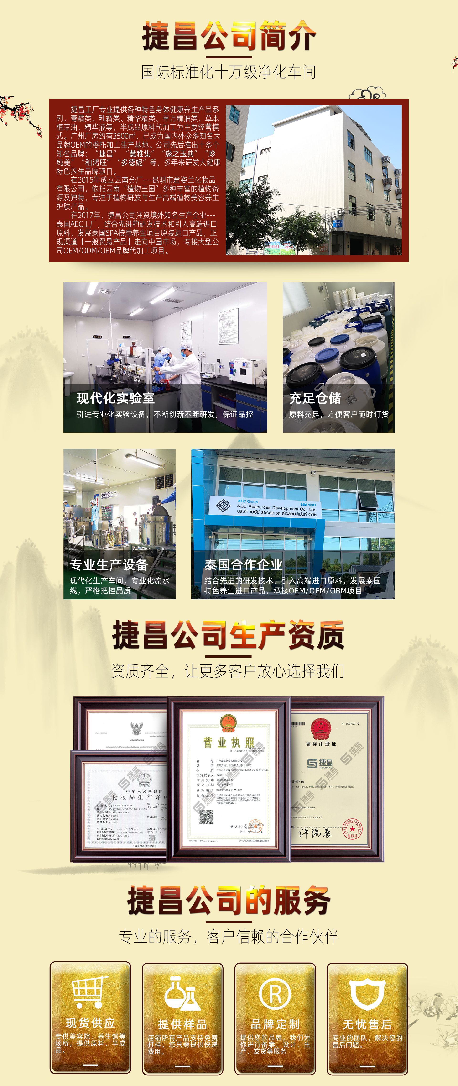 本公司一直提倡以“仁、義、禮、智、信、廉”的人文精神作為經營準則。工廠專業提供各種特色身體健康養生產品系列,膏霜類、乳霜類、精華霜類、單方精油類、草本植萃油、精華液等,半成品原料代加工為主要經營模式,在國內創辦生產企業——廣州捷昌化妝品有限公司,廠房約有4000㎡,已成為國內外眾多知名大品牌OEM的委托加工生產基地。隨著膏霜乳類、精油類、植萃油、精華液等特色項目在國內市場的蓬勃發展,公司先后推出十多個知名品牌:“捷昌” “慧雅集”“緣之玉典”“珍純美”“和鴻旺”“多德妮”等,多年來研發大健康特色養生品牌項目。產以安全效優的口碑得到廣大消費者的高度評價。