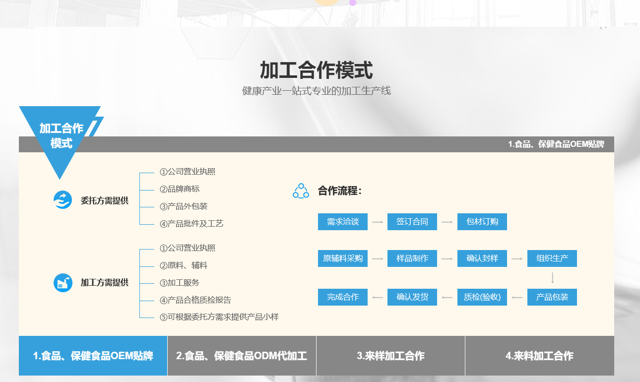 代工品類:丸劑 片劑 粉劑 口服液飲品 軟糖 硬膠囊 軟膠囊 膏滋 調制乳粉 特殊膳食 普通食品 膏貼 乳膏 噴劑 凝膠 水劑 霜膏