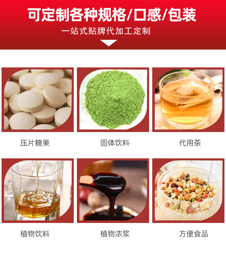 公司專業致力于營養食品、保健食品、植物萃取、膨化食品、果蔬酵素、燕窩制品的科研,產品劑型涉及片劑、粉劑、顆粒劑、袋泡茶、代用茶、口服液、易拉罐、凝膠、營養早餐、袋裝果凍、即時燕窩、凝膠糖果、壓片糖果、代餐粉、固體飲料、液體飲料、方便食品、膠原蛋白等,提供口服液代加工、超微粉碎代加工、固體飲料代加工、袋泡茶代加工、靈芝破壁孢子粉代加工、肽產品代加工、化妝品系列代加工、片劑代加工、膠囊代加工、中藥提取代加工等,同時支持保健食品原料供應、靈芝破壁孢子粉、靈芝切片、靈芝多糖、瑪咖果《粉、片》、破壁松花粉、靈芝多糖、蟲草、蟲草粉、蟲草多糖、大豆肽、納豆片、白蕓豆,以及來料加工、貼牌、灌裝、免費打樣、一站式貼牌定制,歡迎留言咨詢合作!