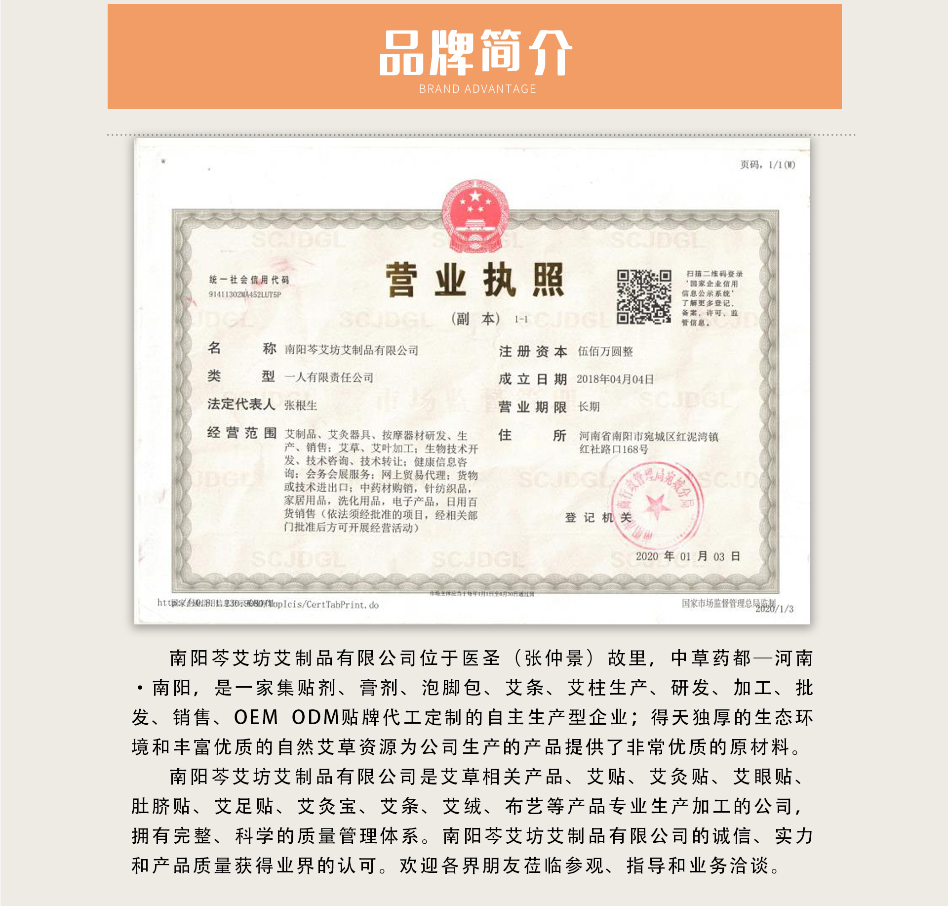 南陽芩艾坊艾制品有限公司是艾草相關產品、艾貼、艾灸貼、艾眼貼、肚臍貼、艾足貼、艾灸寶、艾條、艾絨、布藝等產品專業生產加工的公司,擁有完整、科學的質量管理體系。南陽芩艾坊艾制品有限公司的誠信、實力和產品質量獲得業界的認可。歡迎各界朋友蒞臨參觀、指導和業務洽談