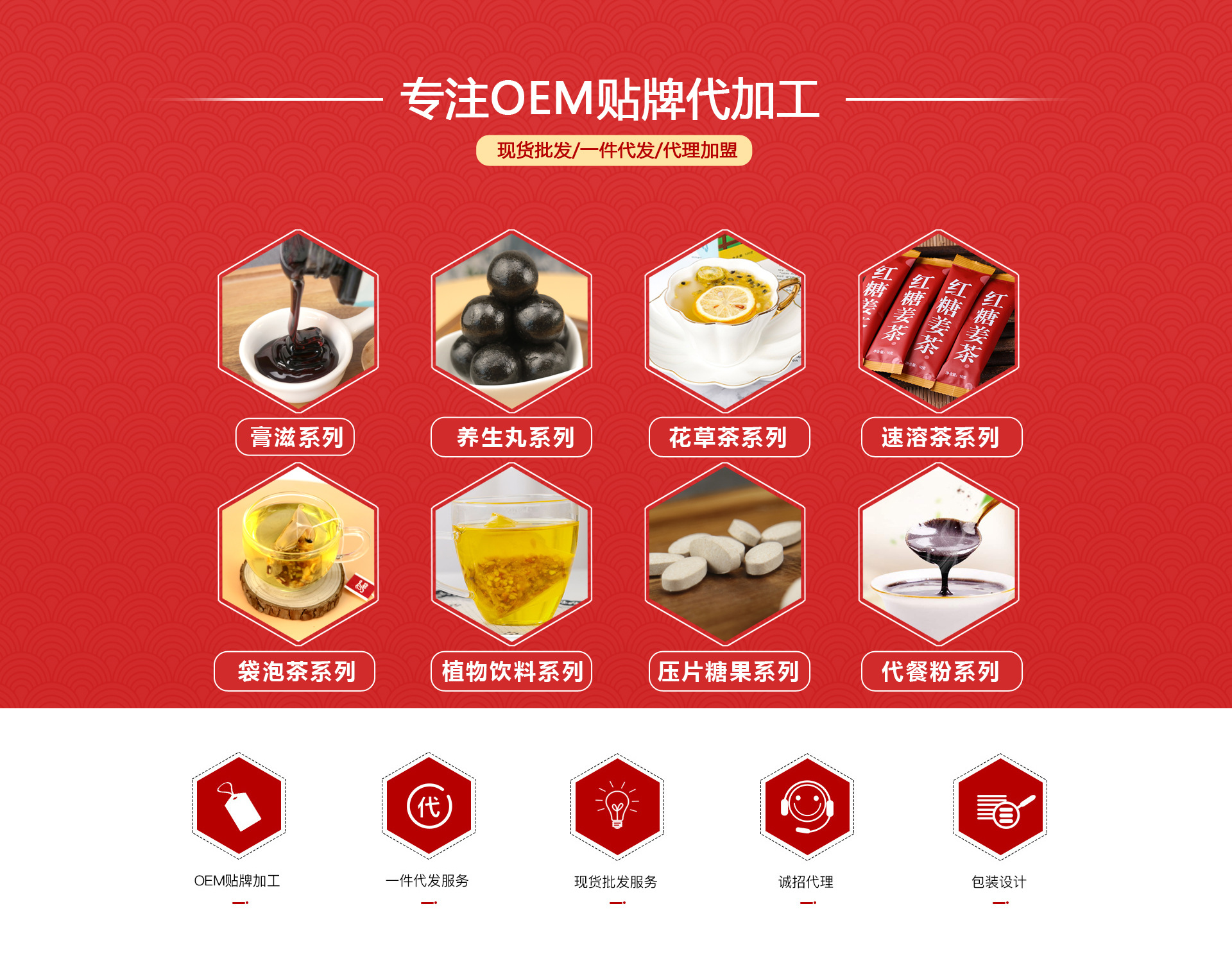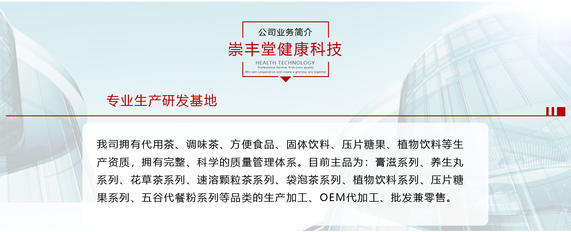 亳州崇豐堂健康科技集生產與銷售為一體的綜合性企業、源頭工廠,專注于健康養生實力品牌。為客戶提供專業的,成套產品配方研發、包裝設計、推廣營銷、多品牌管理,提供實戰型的營銷解決方案。公司各類資質和生產設備齊全,車間按照SC標準設計,出貨效率高,服務認真負責,是省內較大較專業的代工企業。 我司擁有代用茶、調味茶、方便食品、固體飲料、壓片糖果、植物飲料等生產資質,擁有完整、科學的質量管理體系。目前主品為:膏滋系列、養生丸系列、花草茶系列、速溶顆粒茶系列、袋泡茶系列、植物飲料系列、壓片糖果系列、五谷代餐粉系列等品類的生產加工、OEM代加工、批發兼零售。系列產品主要服務于:品牌代加工、電商淘寶、拼多多、直播帶貨代發、各大商場超市、社區養生館等,專業一站式服務。公司的誠信、實力和產品質量獲得業界的認可,歡迎各界朋友蒞臨參觀、指導和業務洽談。