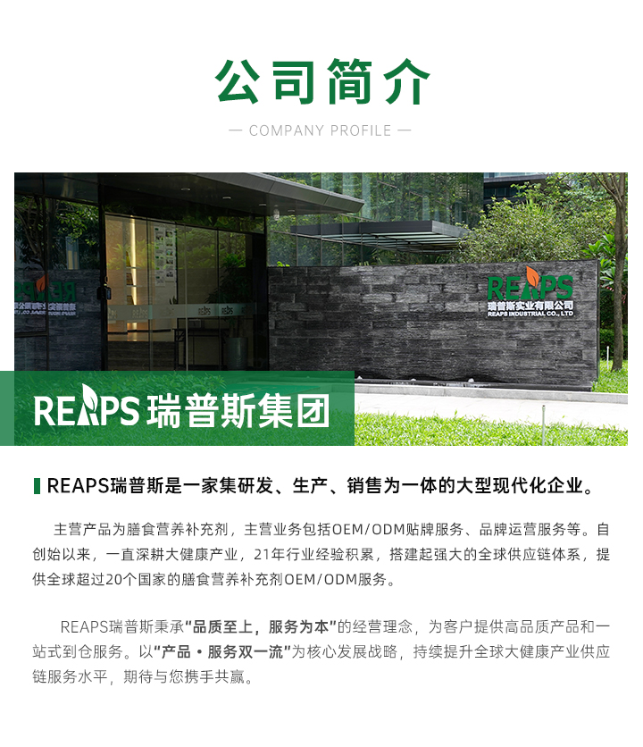 瑞普斯(深圳)實業有限公司是一家集研發、生產、銷售為一體的大型現代化企業,主營產品為膳食營養補充劑,主營業務包括OEM/ODM貼牌服務、品牌運營服務等。自創始以來,一直深耕大健康產業,21年行業經驗積累,始終致力于服務和發展更具有社會價值的優質品牌,鏈接全球大健康優質資源,為大健康產業提供全球供應鏈解決方案及品牌運營服務。