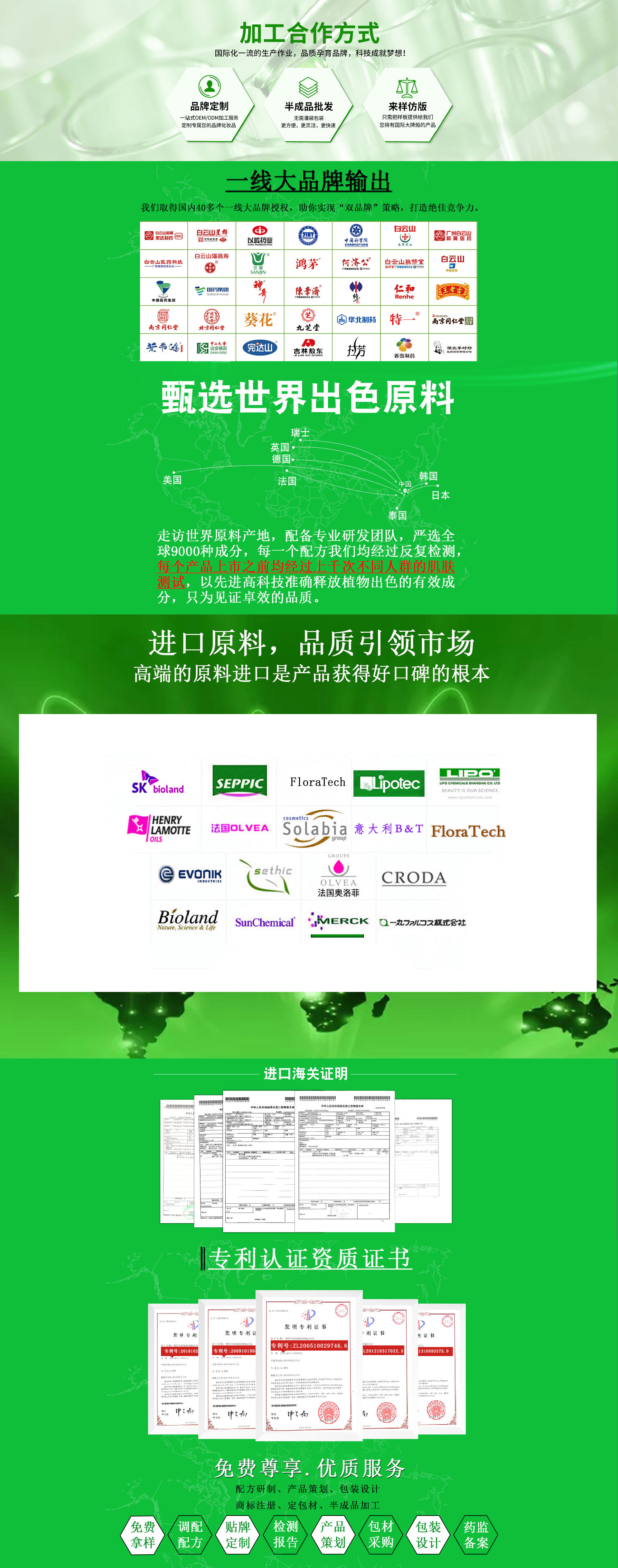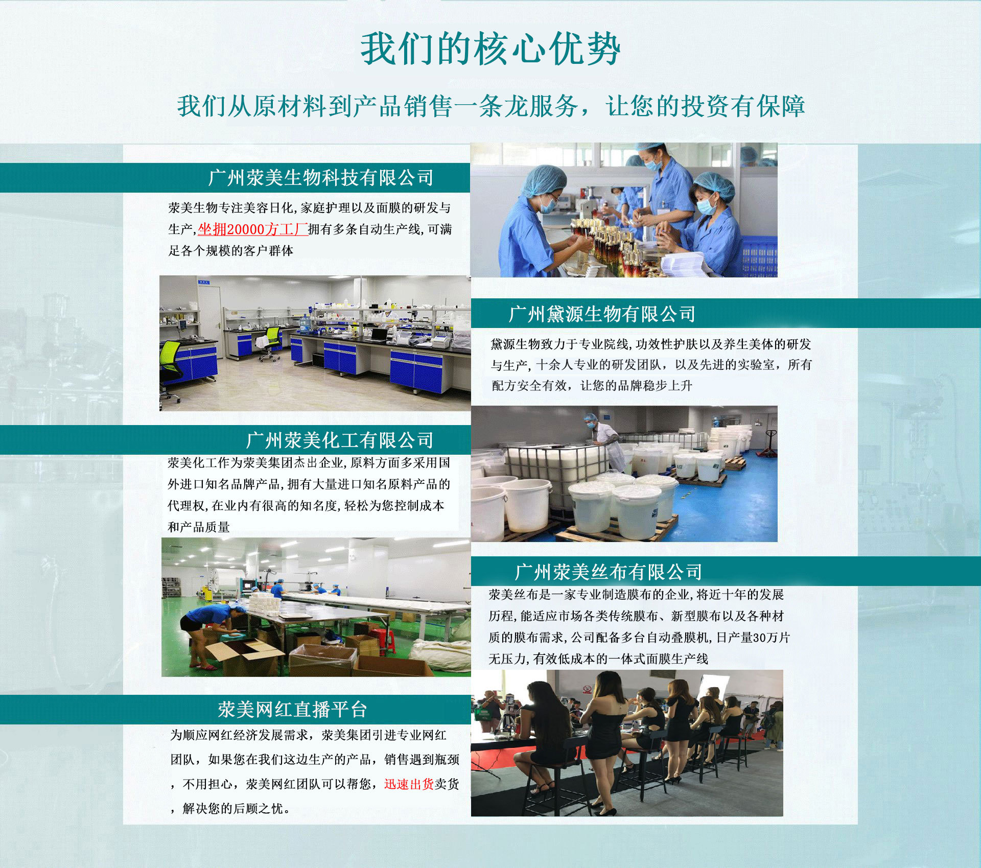廣州滎美生物從原材料到產(chǎn)品銷售一條龍服務(wù),讓您的投資有保障。專注美容日化,家庭護(hù)理以及面膜的研發(fā)與生產(chǎn),坐擁20000方工廠擁有多條自動(dòng)生產(chǎn)線,可滿足網(wǎng)紅主播、微商新零售團(tuán)隊(duì),美業(yè)日化線、專業(yè)線不同級(jí)別品牌商代理商各種規(guī)模的訂單需求。滎美化工作為滎美集團(tuán)杰出企業(yè),原料方面多采用國(guó)外進(jìn)口知名品牌,擁有大量進(jìn)口知名原料產(chǎn)品的代理權(quán),在業(yè)內(nèi)有很高的知名度,輕松為您控制成本和把控產(chǎn)品質(zhì)量。公司根據(jù)市場(chǎng)反饋不斷創(chuàng)新思維,勇于開拓富有競(jìng)爭(zhēng)力產(chǎn)品投入市場(chǎng),攜手上下游廠商持續(xù)穩(wěn)步健康發(fā)展。