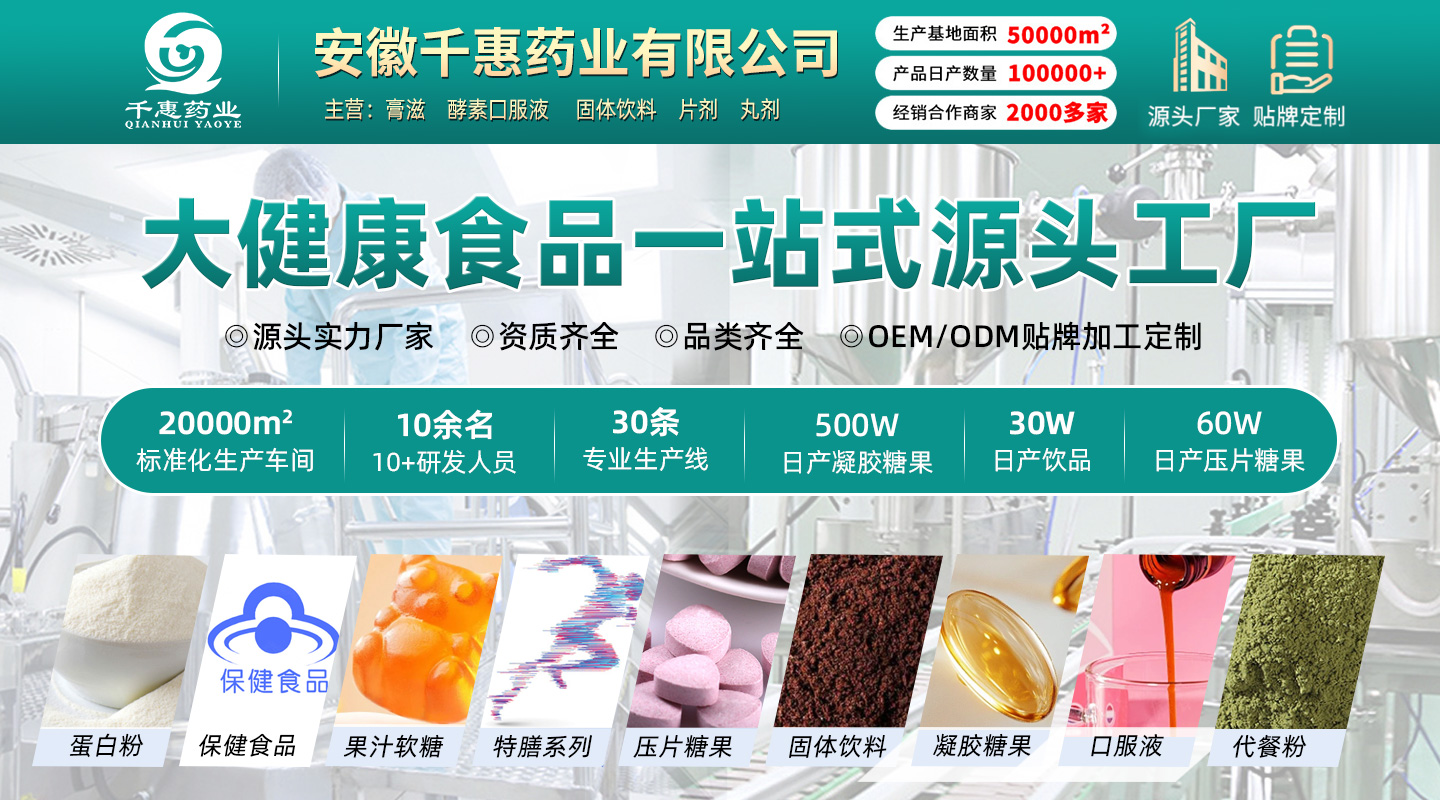 安徽千惠藥業有限公司是一家集研發、生產、銷售及物流于一體的現代化健康產業企業。公司注冊資本1000萬元人民幣,投資總額達5000萬元,占地面積35.5畝,建筑面積超3萬平方米,擁有十萬級潔凈車間和專業檢驗實驗室,年生產能力超6000萬元。核心業務與產品,公司專注于大健康產業10年、特殊膳食、營養補充劑等領域的研發與生產,產品涵蓋片劑、固體飲料、壓片糖果、軟膠囊、硬膠囊等多劑型。提供OEM貼牌生產,合作品牌包括南京同仁堂、國藥藥材,國藥健康等。