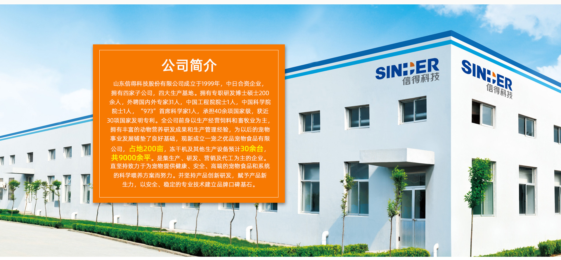 公司位于山東省濰坊市諸城市,占地200畝,是以寵物主糧、零食、保健品等產品加工生產的公司,擁有科學的質量管理體系,完善的生產、研發、銷售、檢測體系。主營寵物凍干主糧、零食,貓狗主糧等。是以生產、銷售及代工為主的企業。公司秉承坦誠守信、互利共贏的經營理念,為廣大用戶伙伴提供安全良好、穩定的產品,出廠前所有產品都經過數道嚴格的檢測,力求生產出滿足于每一位顧客的產品。